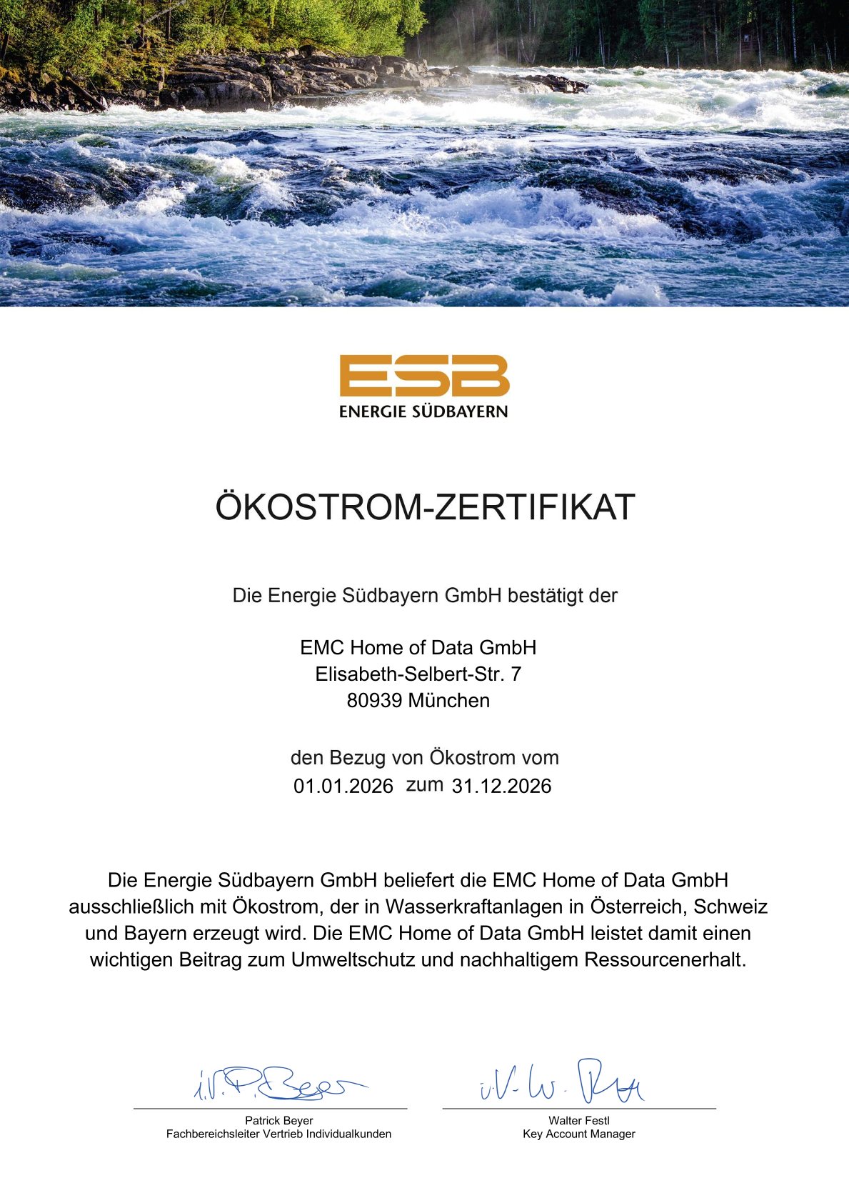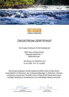 EMC Home of Data sieht sich hier klar in der Verantwortung und betreibt seine Anlagen, sowie die zigtausend angeschlossenen Server ihrer Kunden ausschließlich mit regionalem Ökostrom aus TÜV-zertifizierten, bayerischen und österreichischen Wasserkraftwerken.