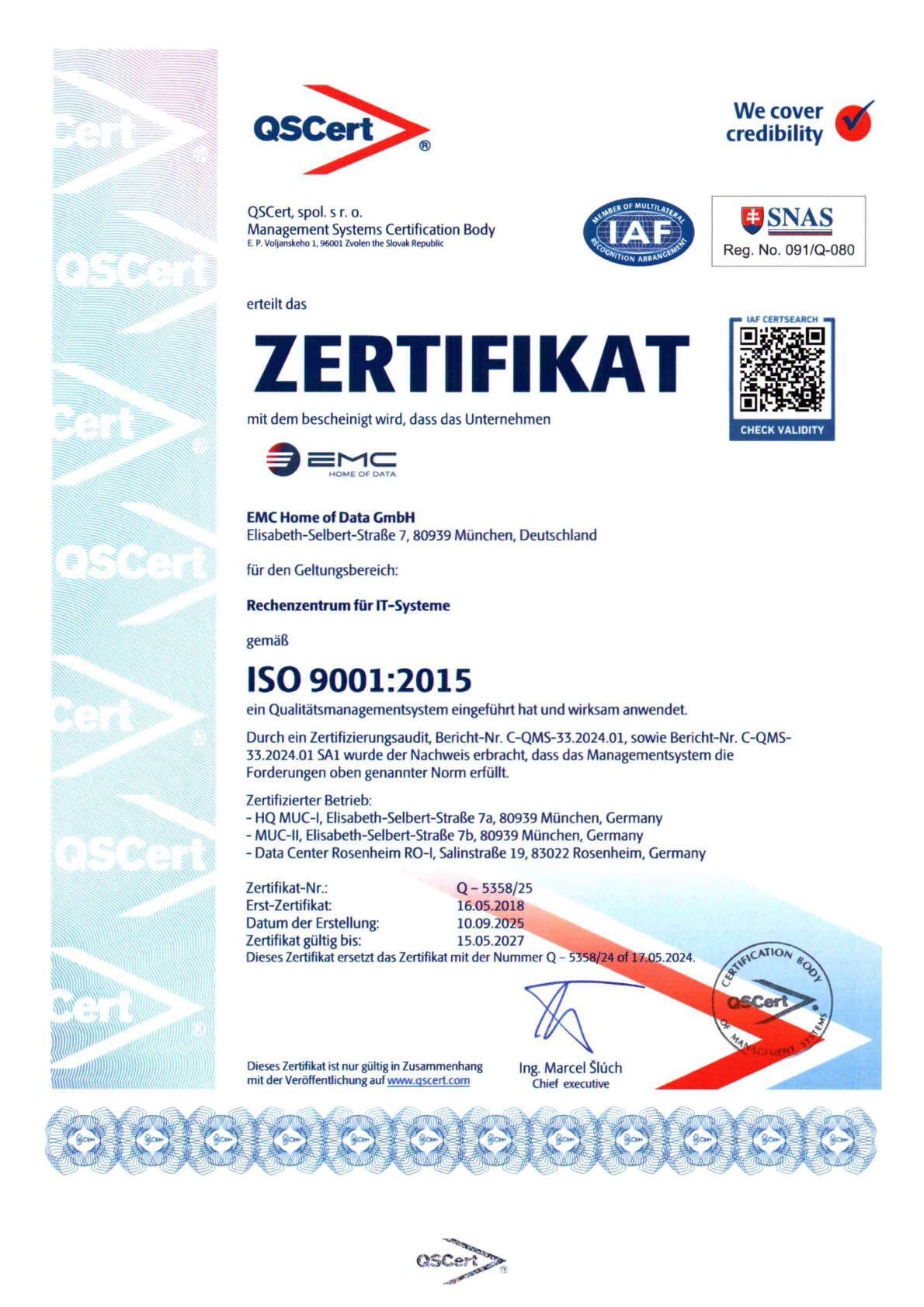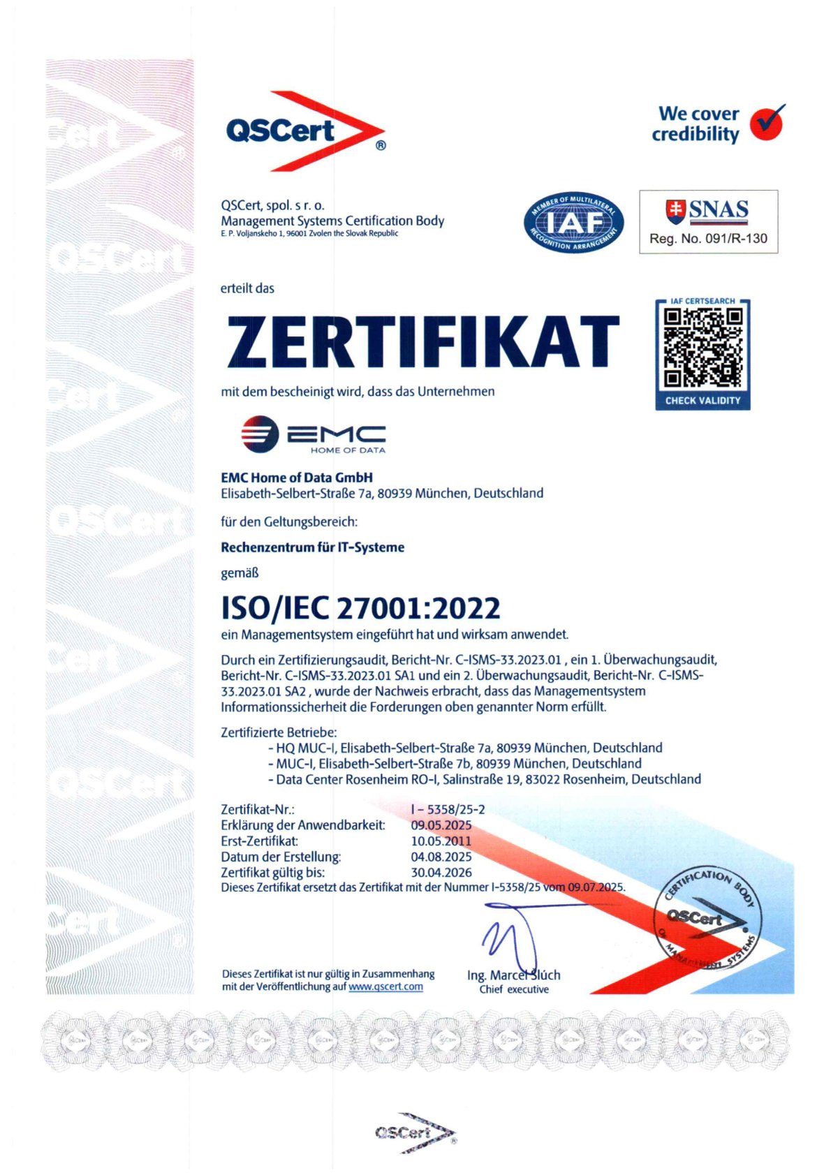 EMC Home of Data ist bereits seit 2012 nach dem Branchenstandard ISO 27001 zertifiziert.
